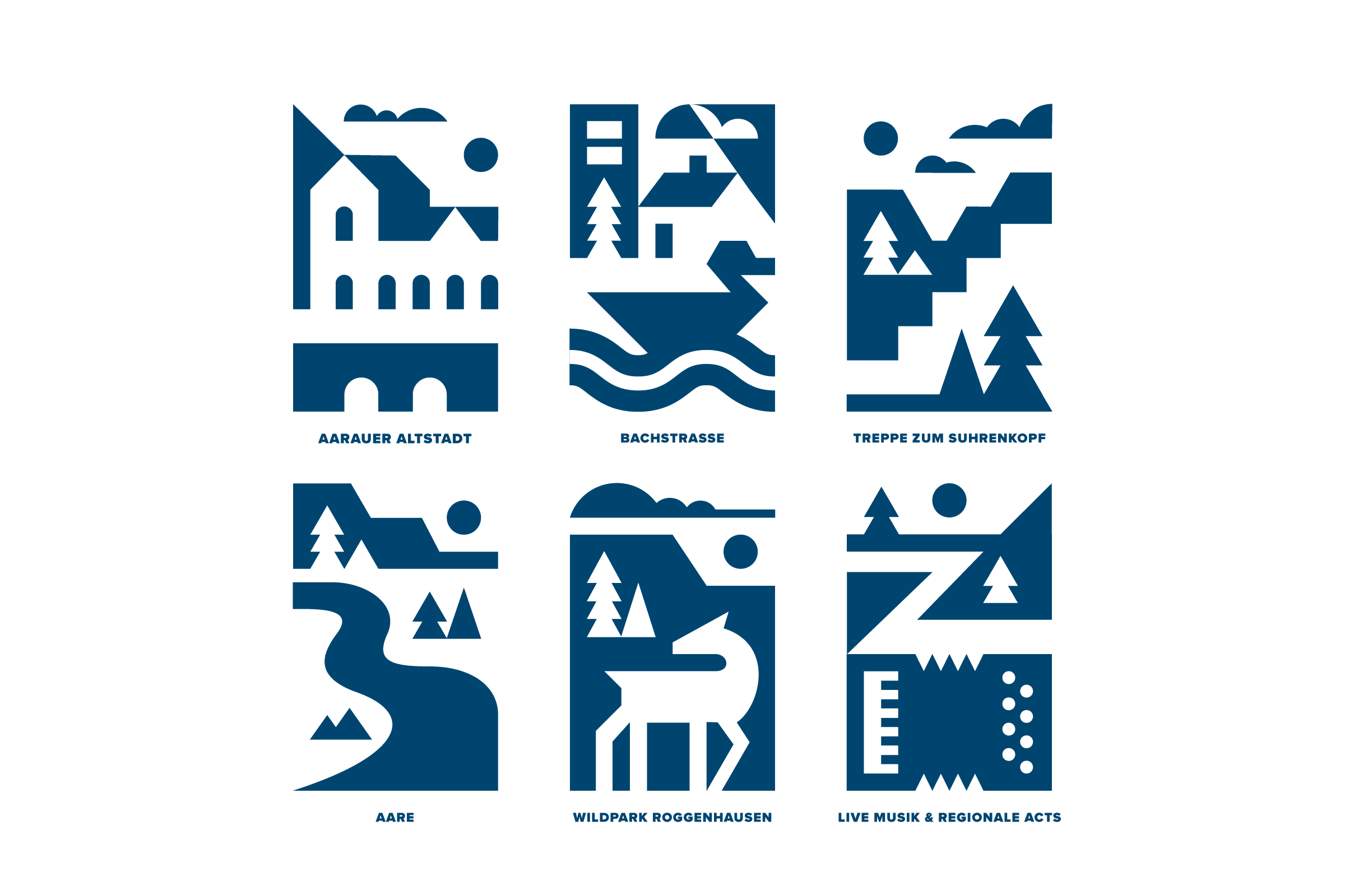 A set of icons to represent the highlights of this run in the underrated city of Aargau. By constraining myself to simple geometric shapes and adhering strictly to a grid, I achieved harmony and visual unity across the set.