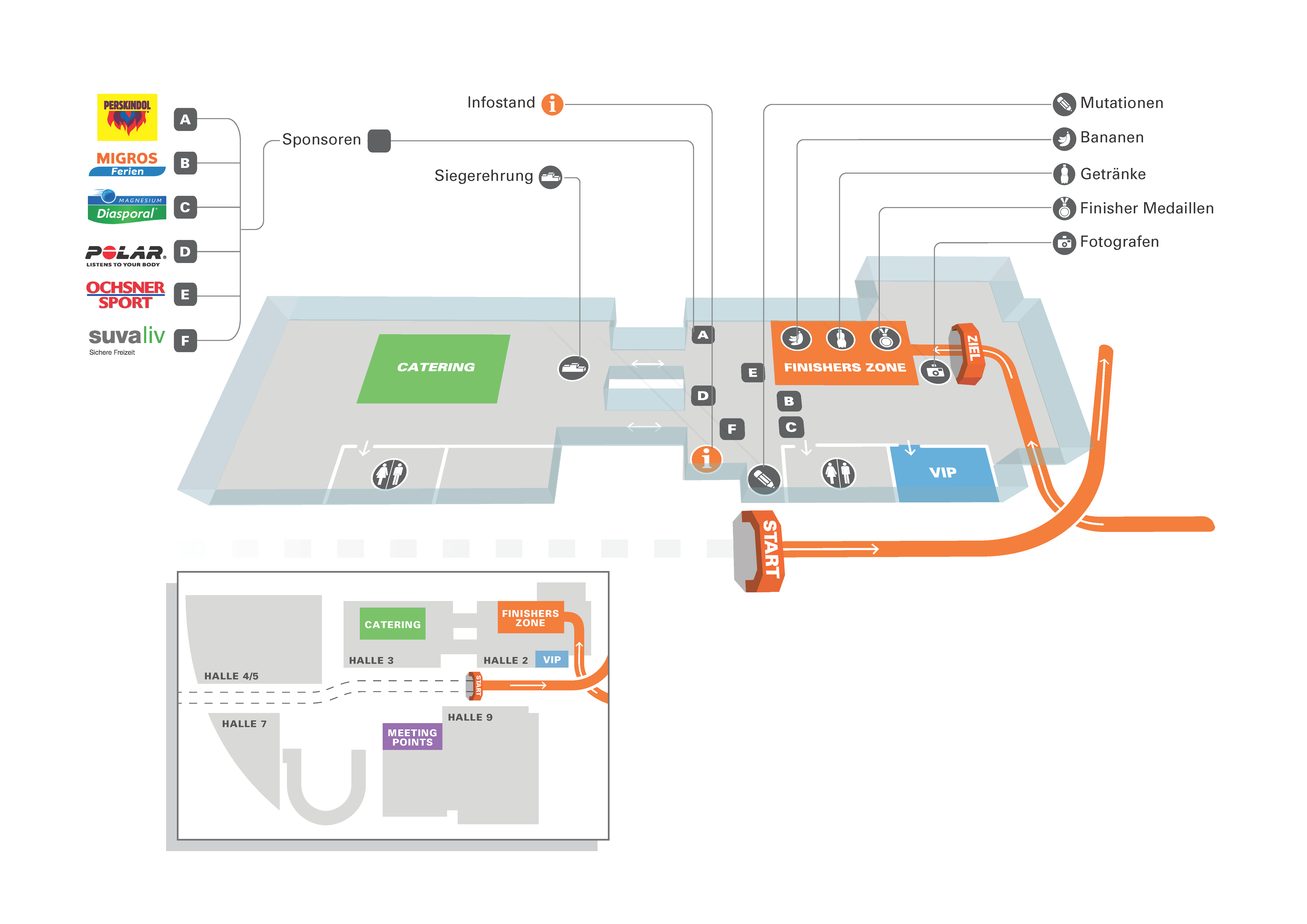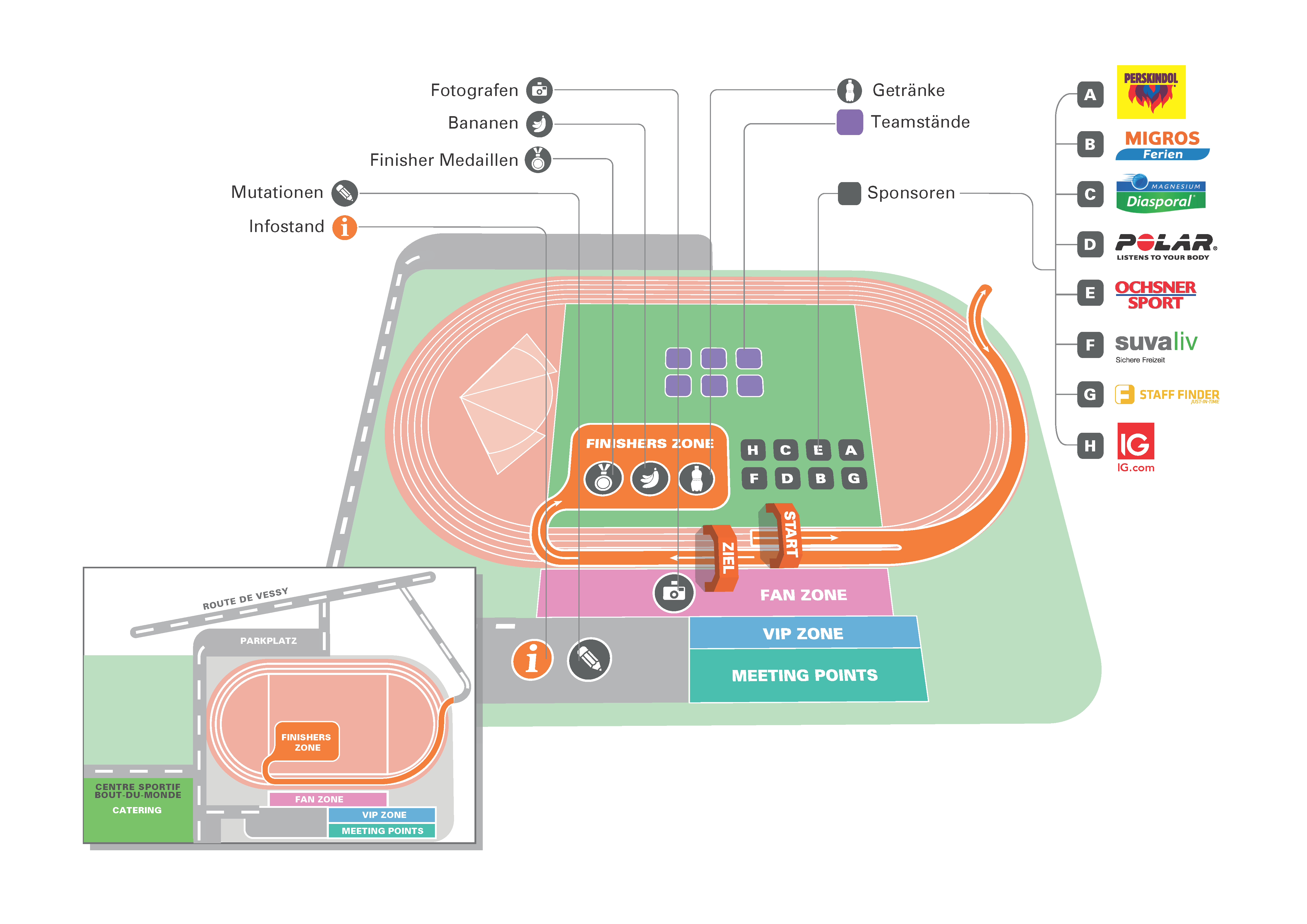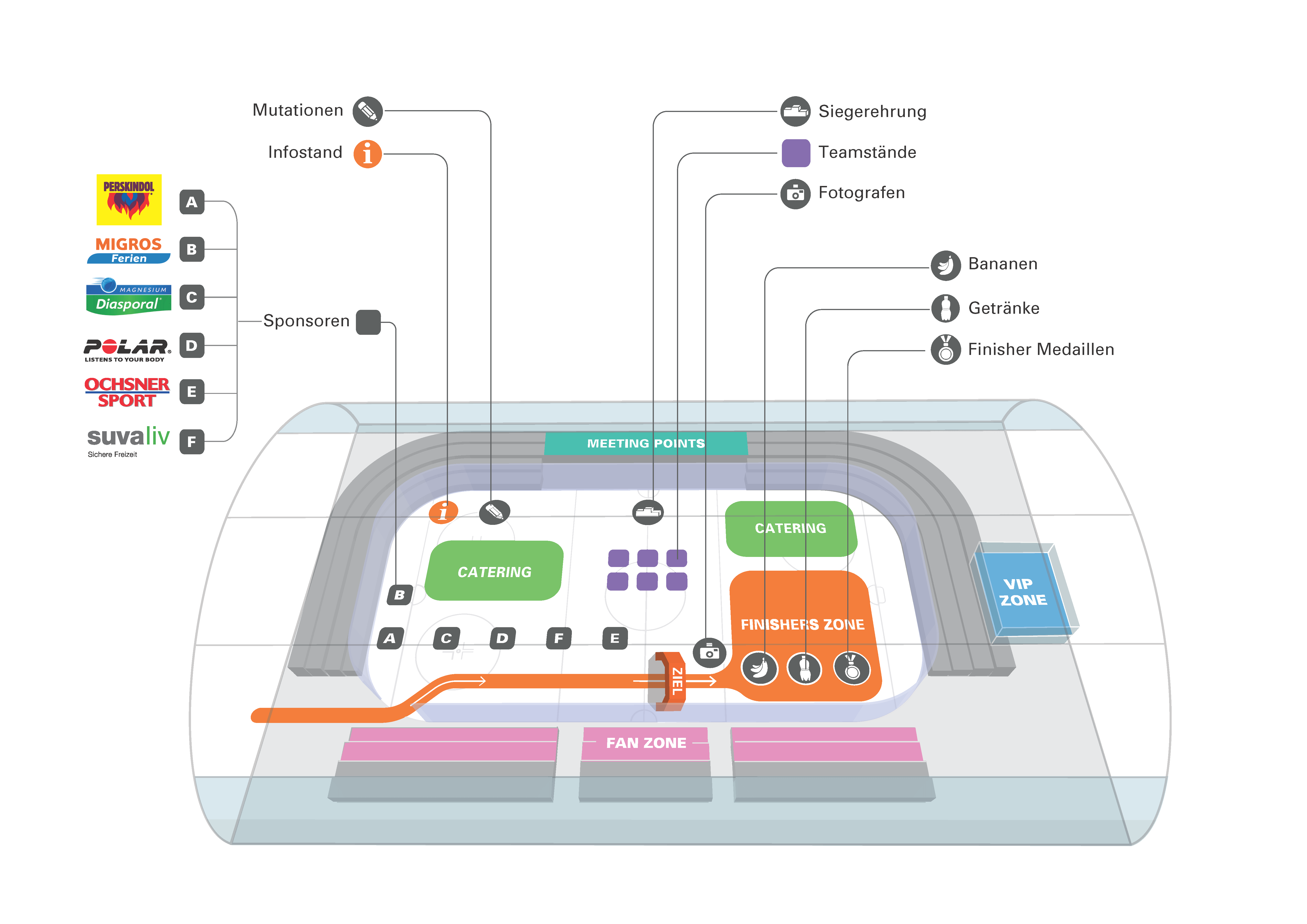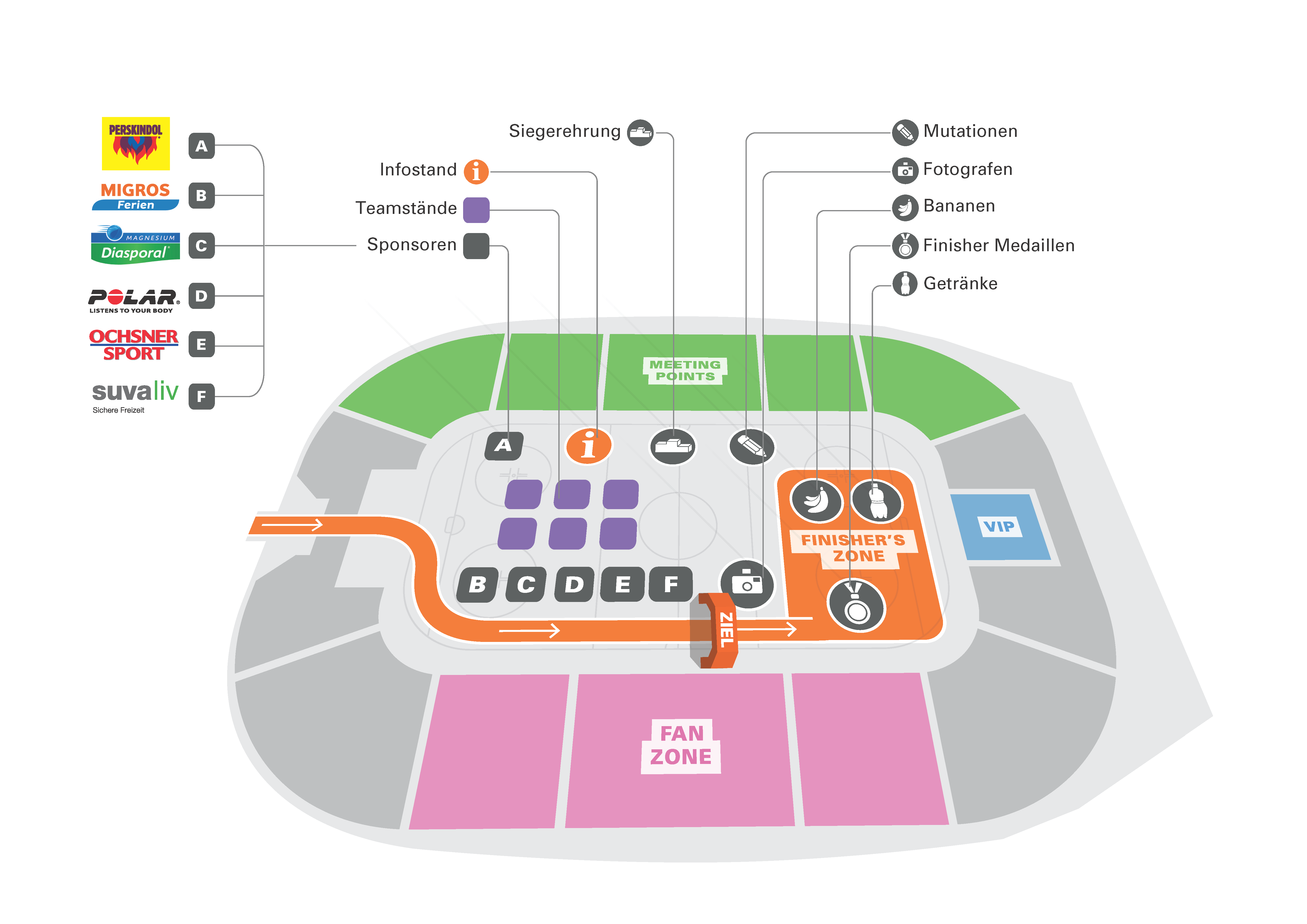 For this running series for companies and team-building, all races finished in a stadium, where the socialising was done. The purpose of these plans was to make finding amenities easier for participants.